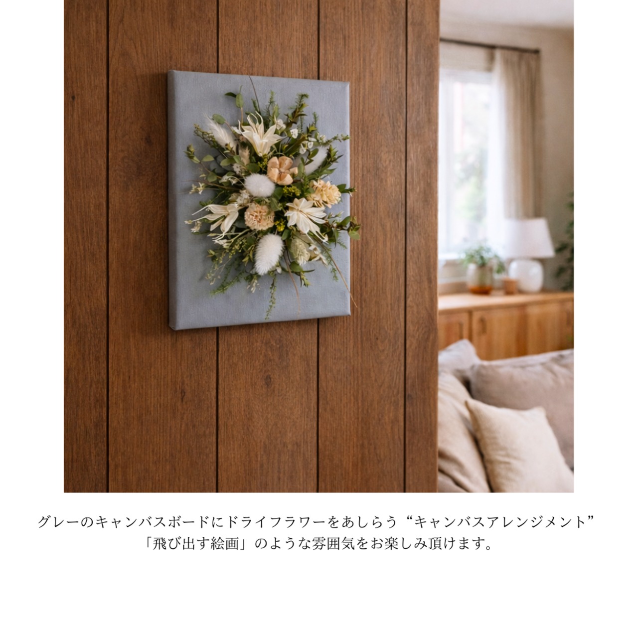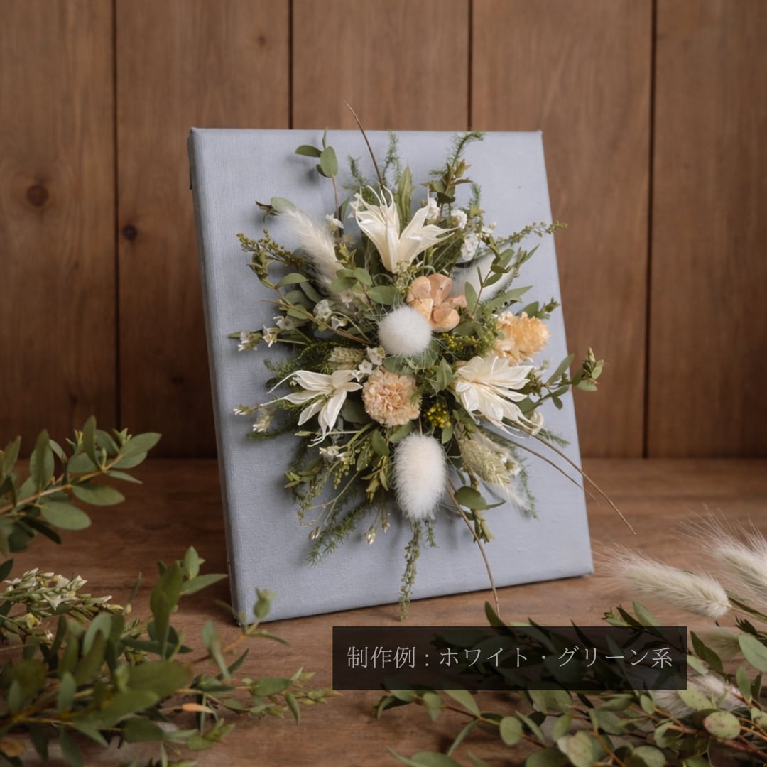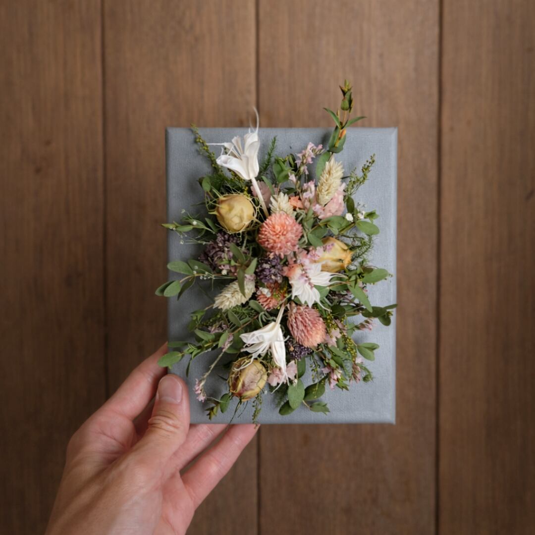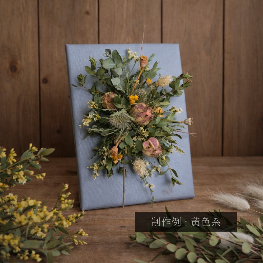 グレーに塗装したキャンバス生地を張った木枠に、ドライフラワーをあしらった「ドライフラワーのキャンバスアレンジメント」。