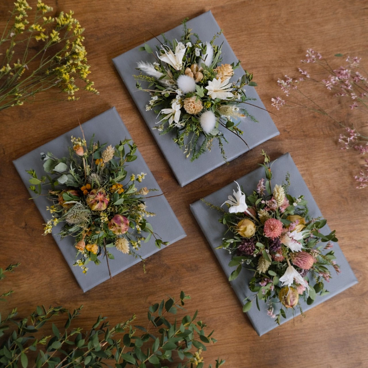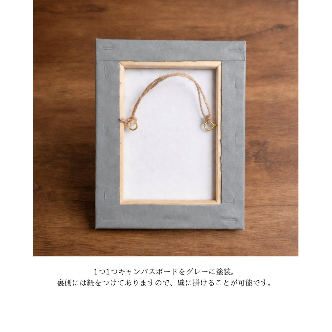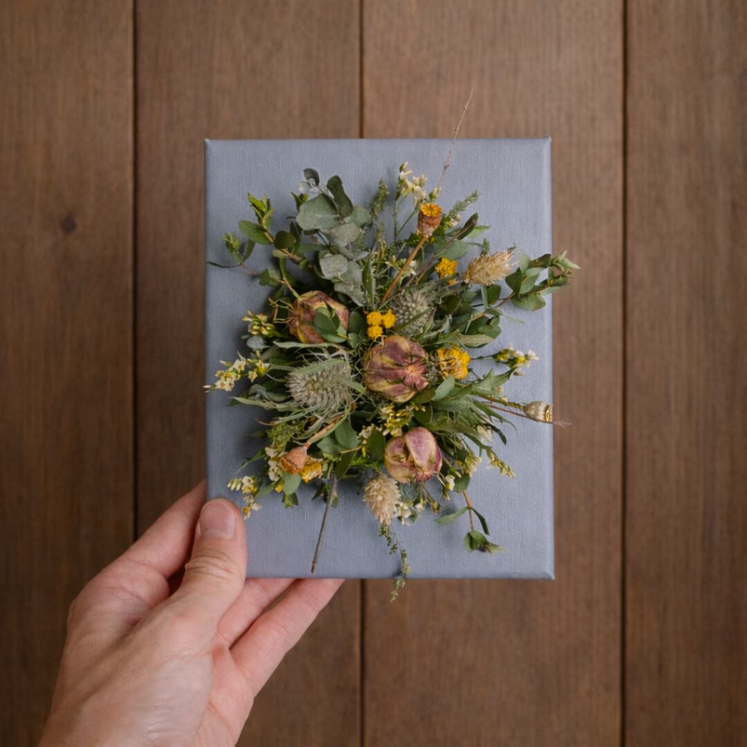グレーに塗装したキャンバス生地を張った木枠に、ドライフラワーをあしらった「ドライフラワーのキャンバスアレンジメント」。