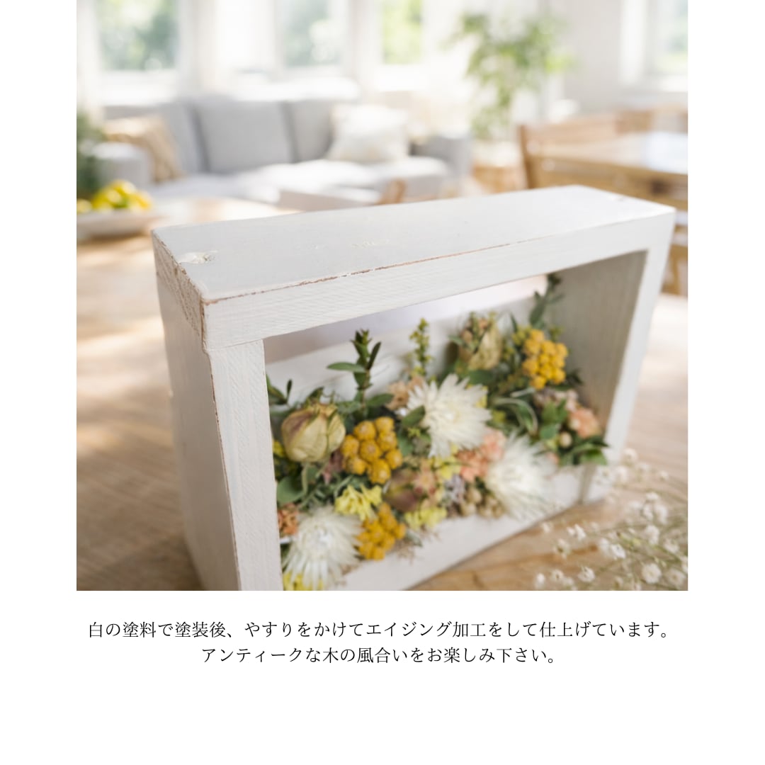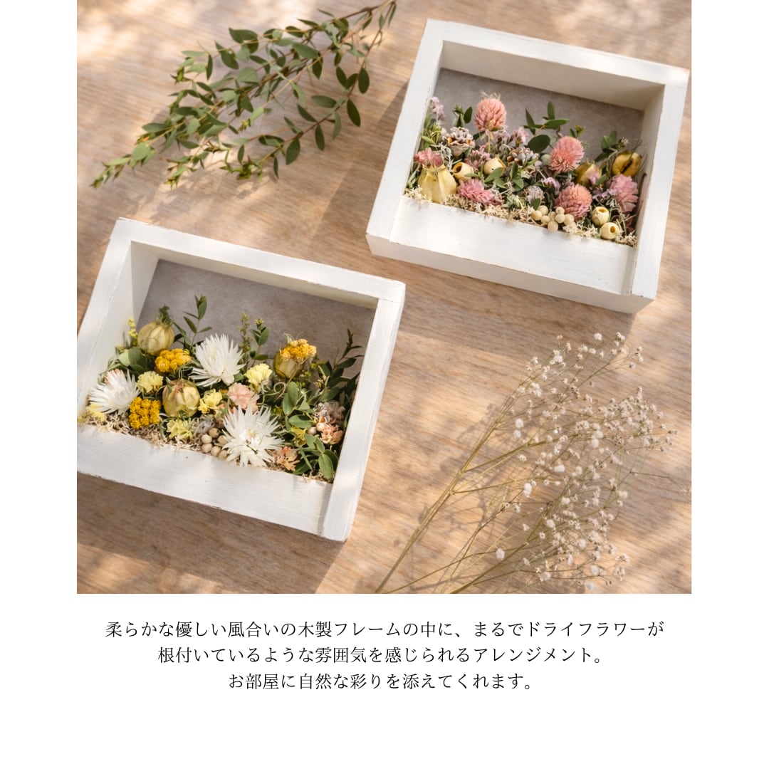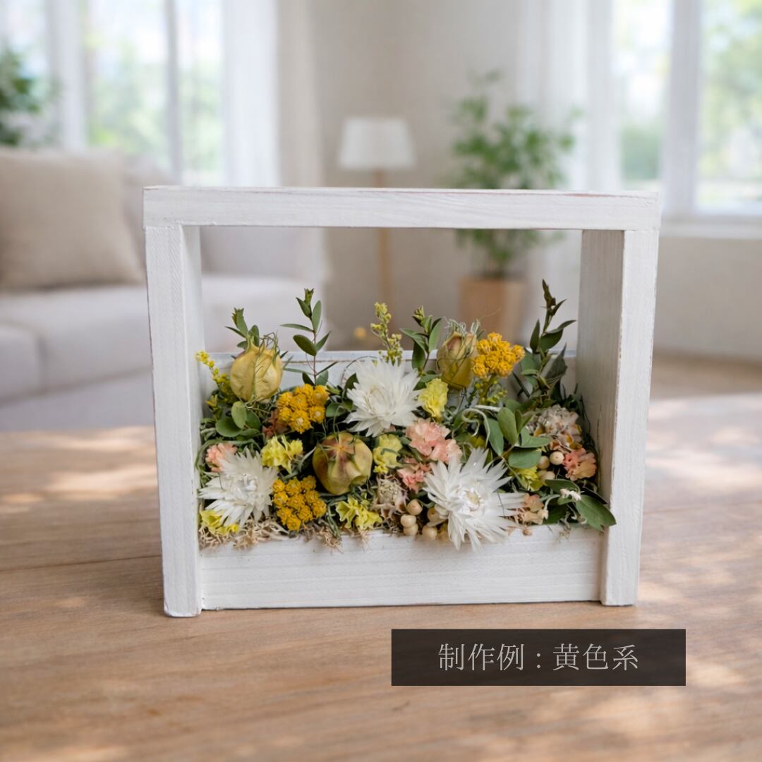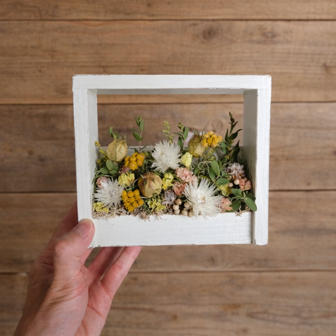 ドライフラワーの木製フレームアレンジメント(ホワイト)