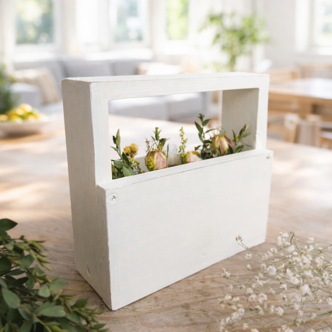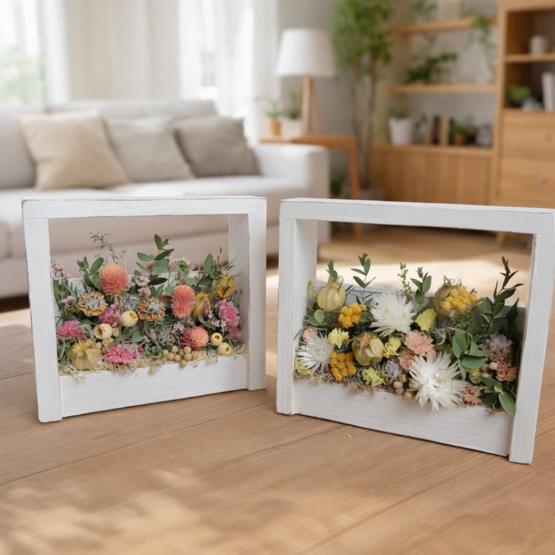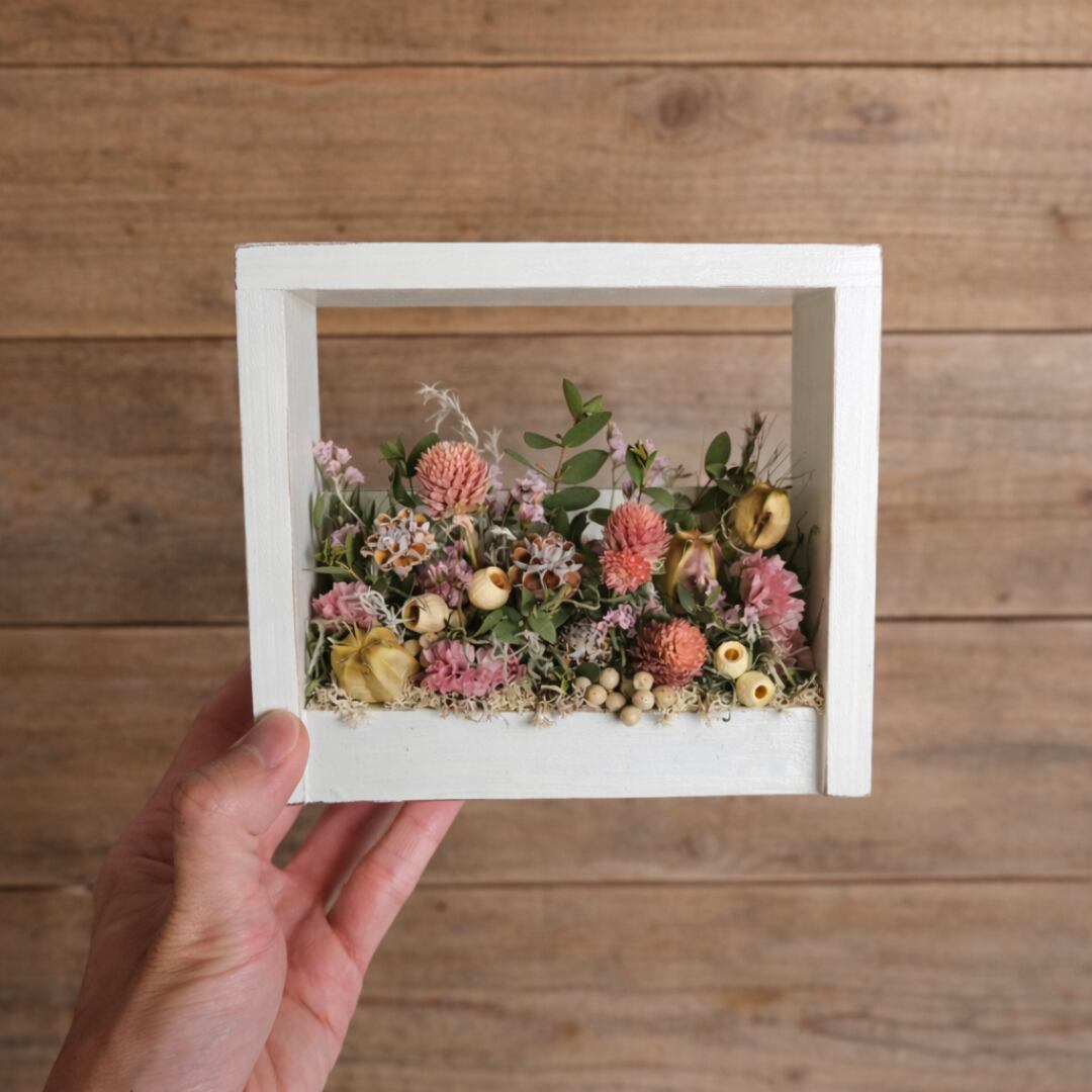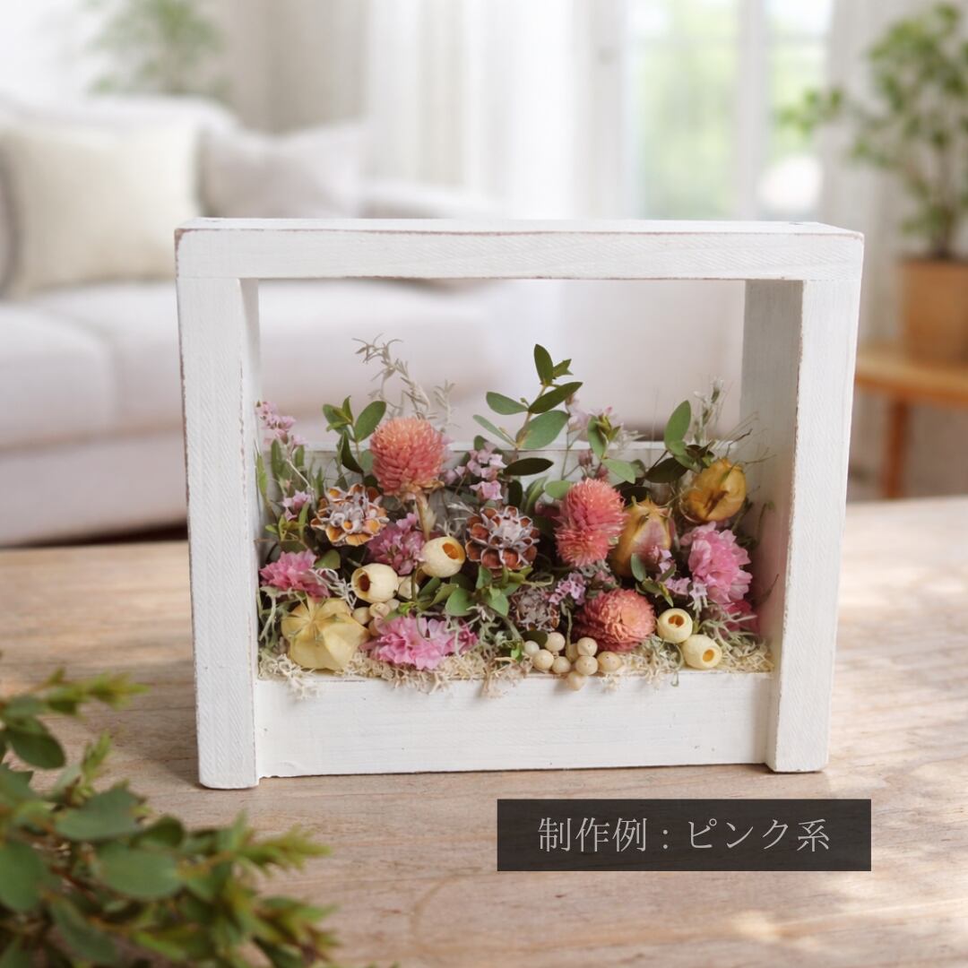 ドライフラワーの木製フレームアレンジメント(ホワイト)