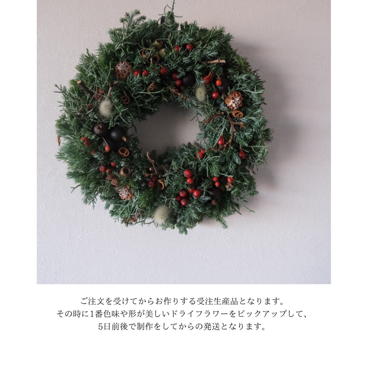冬の森の静けさと、クリスマスの温かな気配を感じられるリースです。
