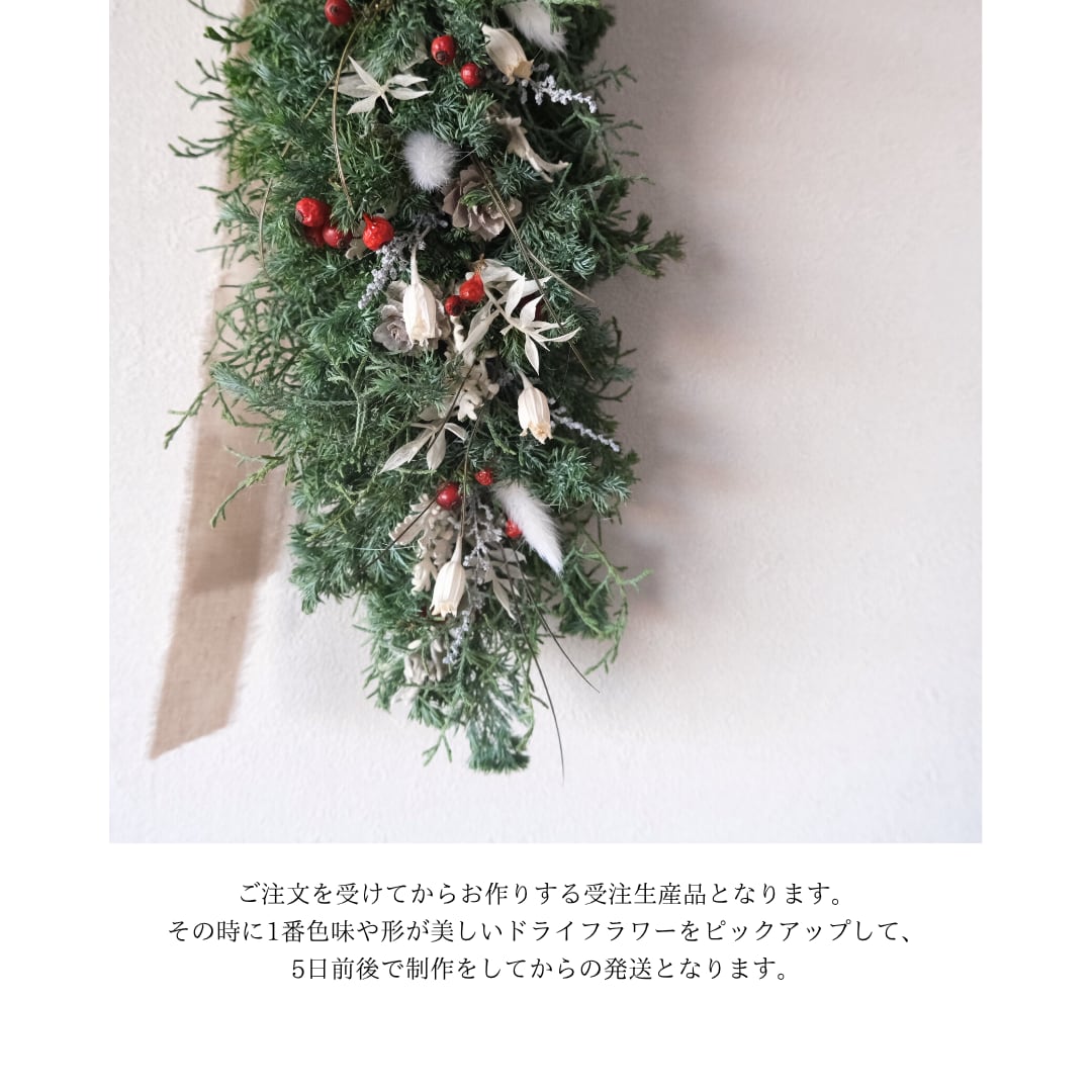 針葉樹は生花の状態でお作りするので、徐々にドライフラワーになる経年変化を楽しめます。