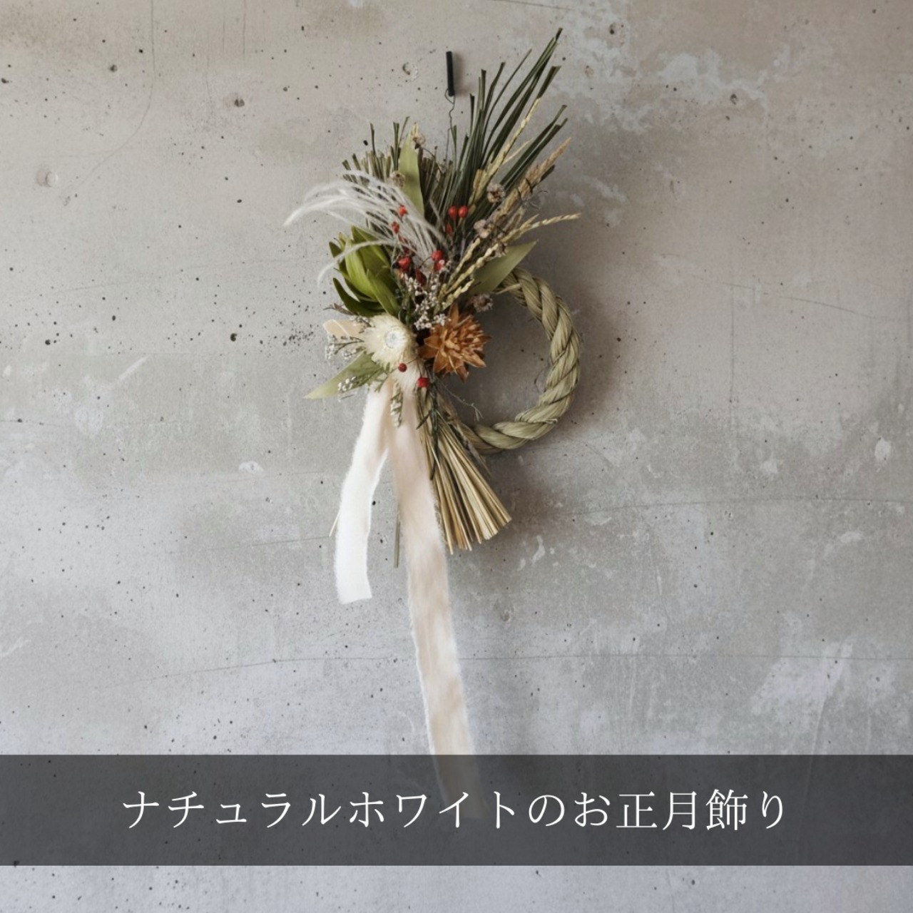 しめ縄に白い花材と瑞々しいグリーン、そして赤い実を添えた、静かな気配をまとう柔らかな雰囲気のお正月飾り。
