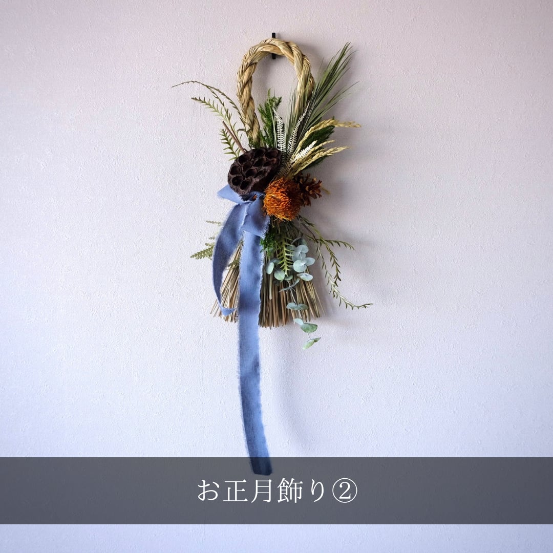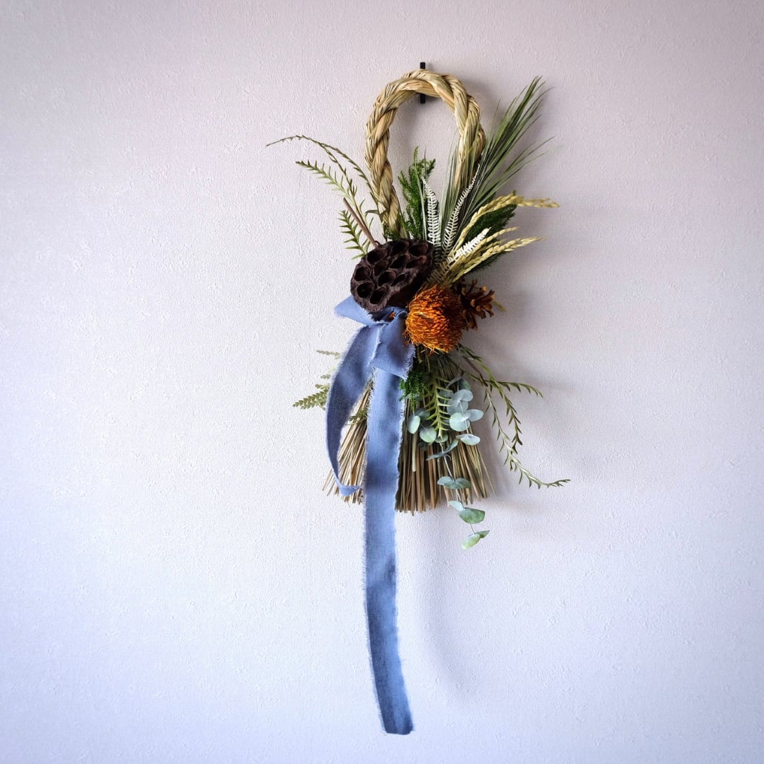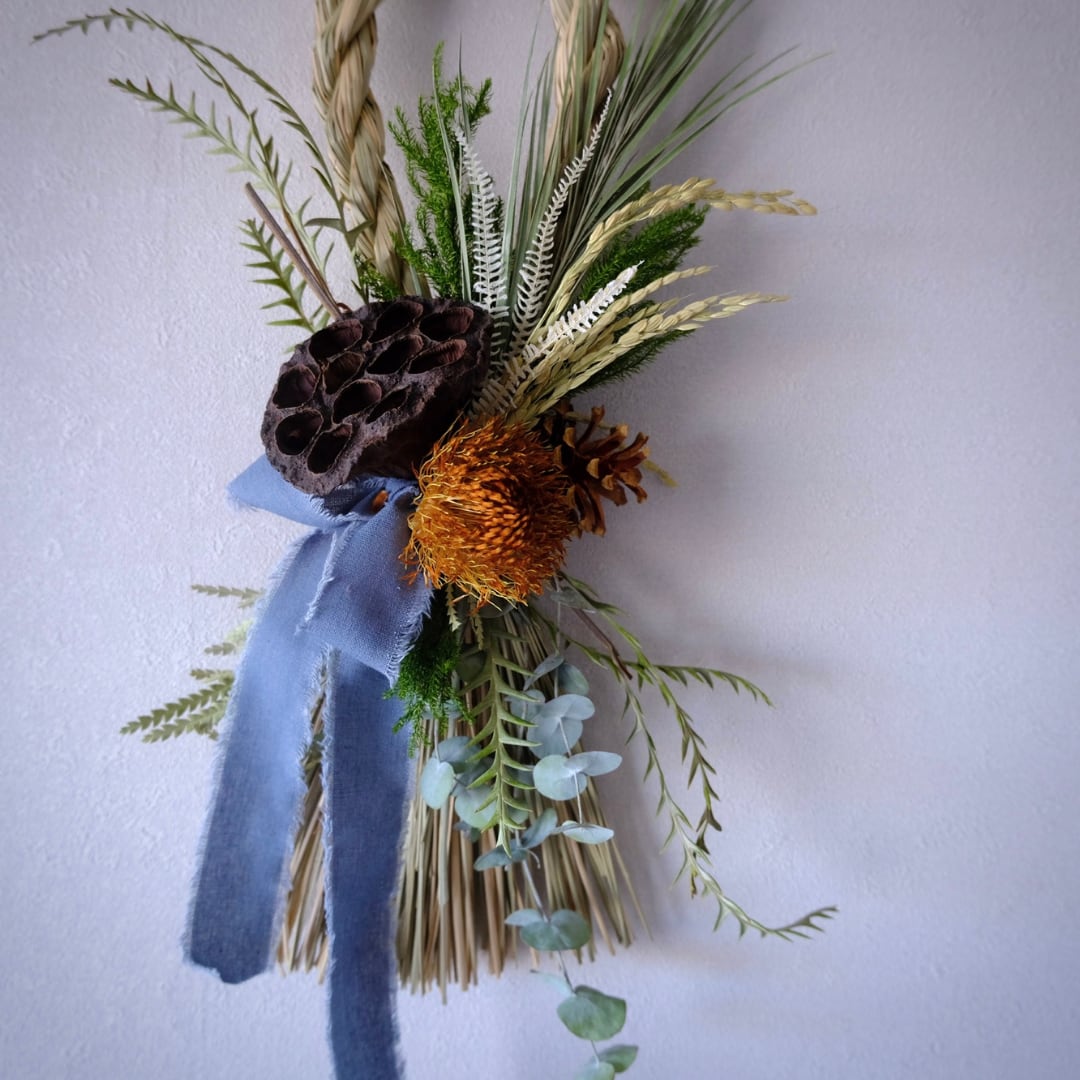 藁の素朴さに、蓮の実やドライフラワー特有の質感を添え、静けさの中に力強さを感じる佇まいに仕上げました。