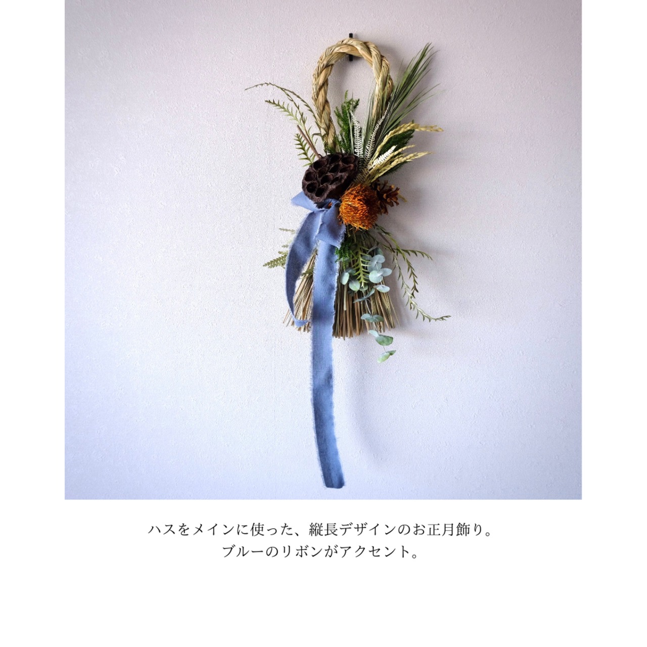 縦のラインが印象的なしめ縄に、稲穂やハス、葉もの重ねた一点もののお正月飾り。