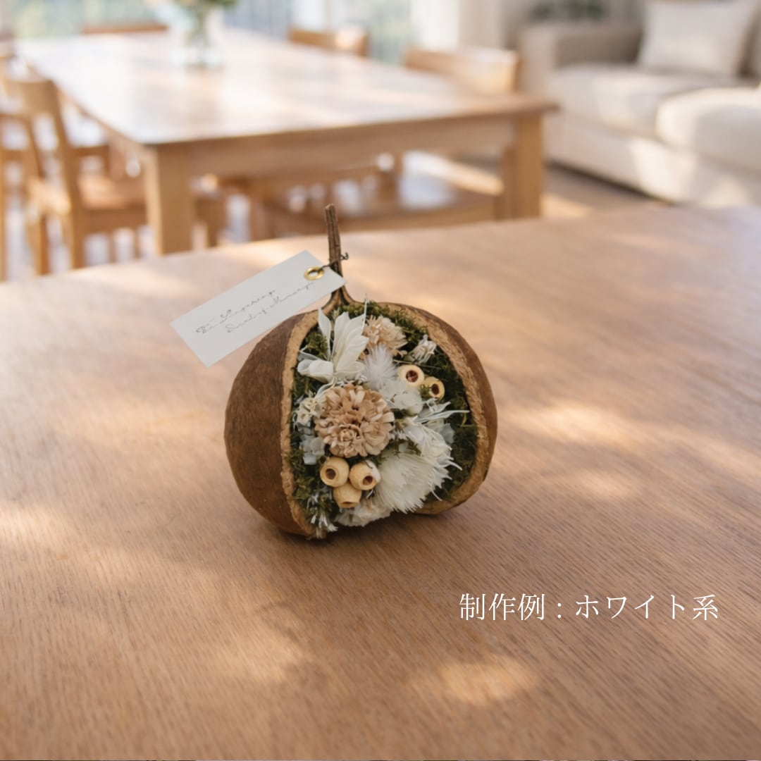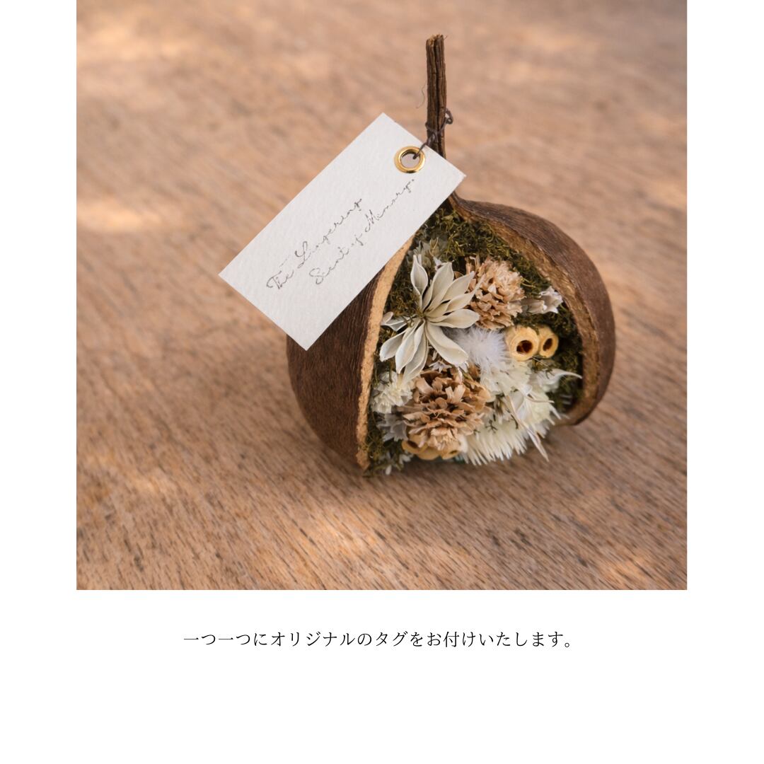 「ブッダナッツ」と呼ばれる木の実を器にした、ドライフラワーのアレンジメント。