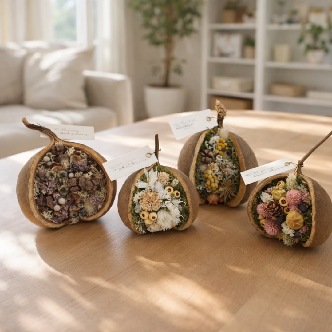 中が空洞になった木の実に、花や実ものをひとつひとつ丁寧に詰め込みました。